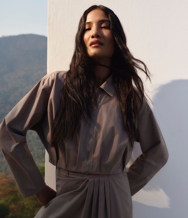Jaqueta em Sarja com Gola Polo e Pregas Cinza