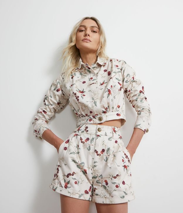 Jaqueta em Sarja Floral com Ombreiras e Botões Dourados