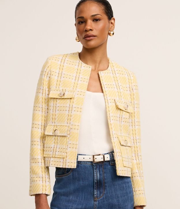 Jaqueta em Tweed Xadrez com Botões nos Bolsos