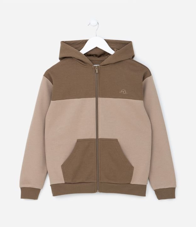 Jaqueta infantil em moletom piquet, com gola capuz, bolso canguru e recortes contrastantes.