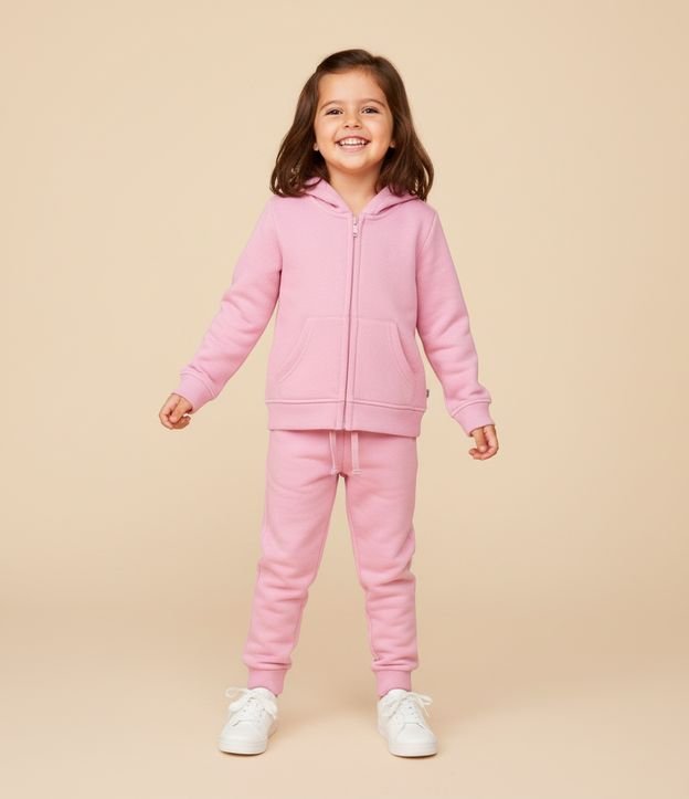 Jaqueta infantil confeccionada em moletom com felpa em algodão certificado BCI e boas práticas ambientais. Possui capuz, manga longa, bolso canguru, bordado no peito e fechamento frontal por zíper, garantindo aconchego e estilo delicado para dias mais frescos.