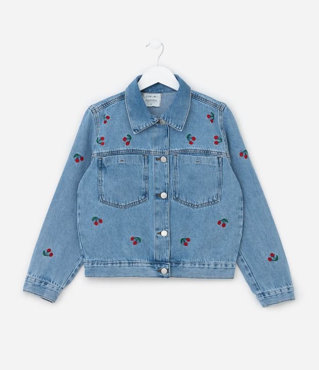 Jaqueta Infantil Jeans com Bordado Cerejas - Tam 5 a 14 Anos Azul