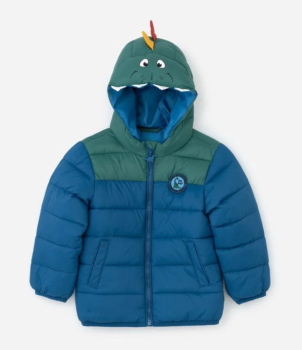 Jaqueta Infantil Puffer com Capuz de Dinossauro – Tam 1 a 6 Anos Azul/Verde