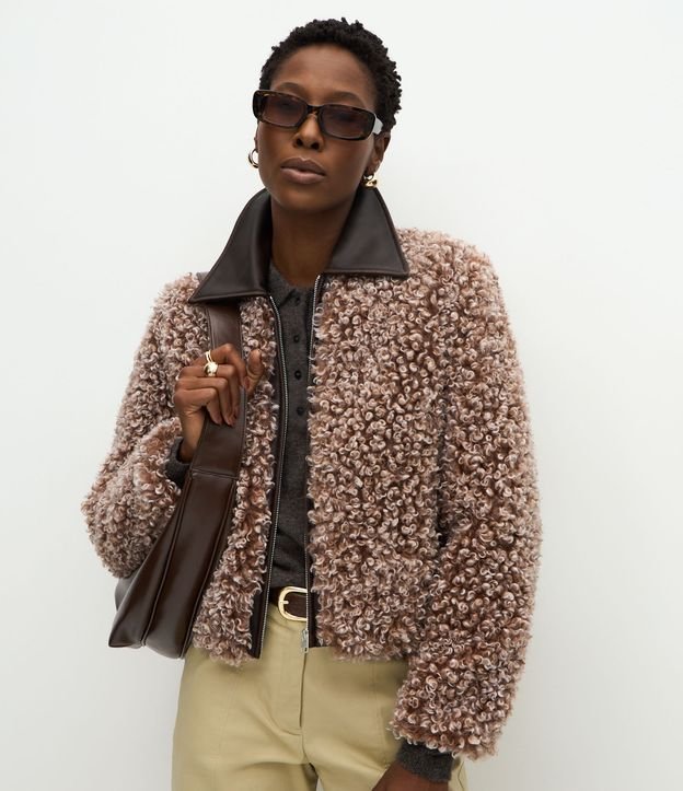 Jaqueta Pesada com Pelos e Gola em PU Marrom