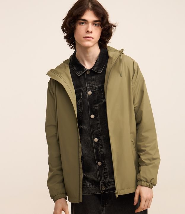 Jaqueta leve confeccionada em microfibra no modelo quebra vento, gola com capuz e cordão, punhos com elástico, zíper fusionado no bolso e sem estampa.
