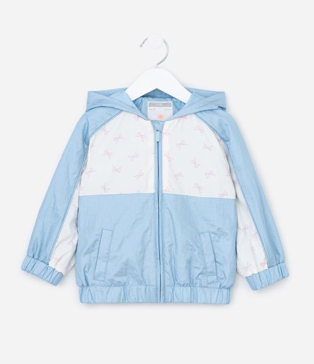 Jaqueta infantil em microfibra. Possui capuz, mangas longas, fechamento em zíper, bolsos na lateral, punhos ajustados e estampa contrastante de lacinhos.