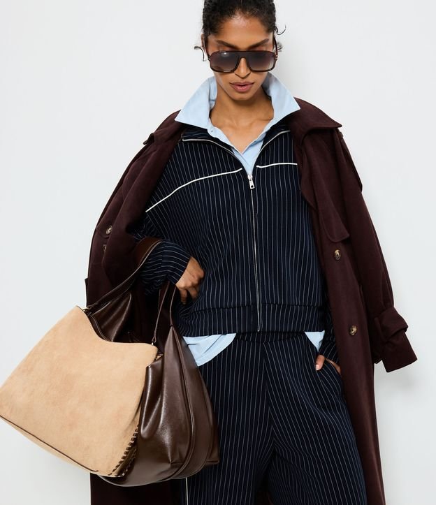 Jaqueta feminina confeccionada com viscose mais sustentável. Possui modelagem regular, zíper frontal, gola alta, estampa listrada e piping frontal.