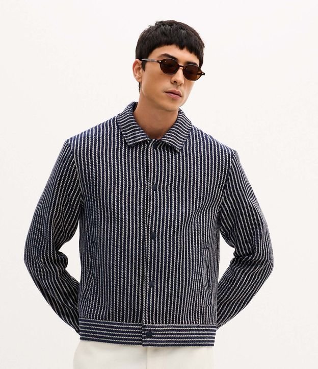 Jaqueta masculina, confeccionada em poliéster com gola colarinho, abotoamento frontal e manga longa. Peça com textura jacquard.
