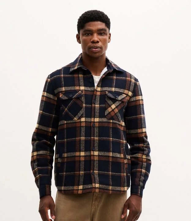 Jaqueta masculina confeccionada com poliéster mais sustentável, em flanela com gola colarinho, abotoamento frontal, bolsos com lapela, bolsos laterais. Peça com estampa xadrez e sherpa interna sendo mais quentinha nos dias mais frios.