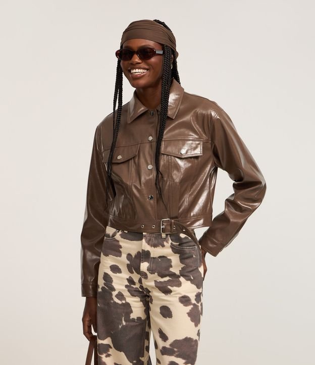 Jaqueta Trucker em PU com Bolsos e Fivela na Barra