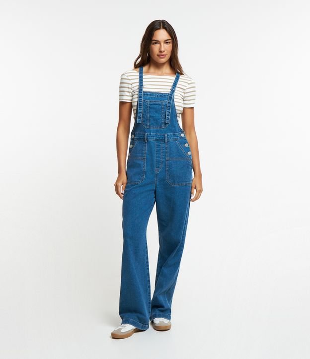 Jardineira em jeans, alças com fivela, bolso no peito, botões laterais e bolsos carpinteiro na parte da frente.