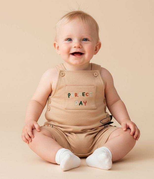 Jardineira Infantil com Bordado Dino e Cristas - Tam 3 a 18 meses Bege