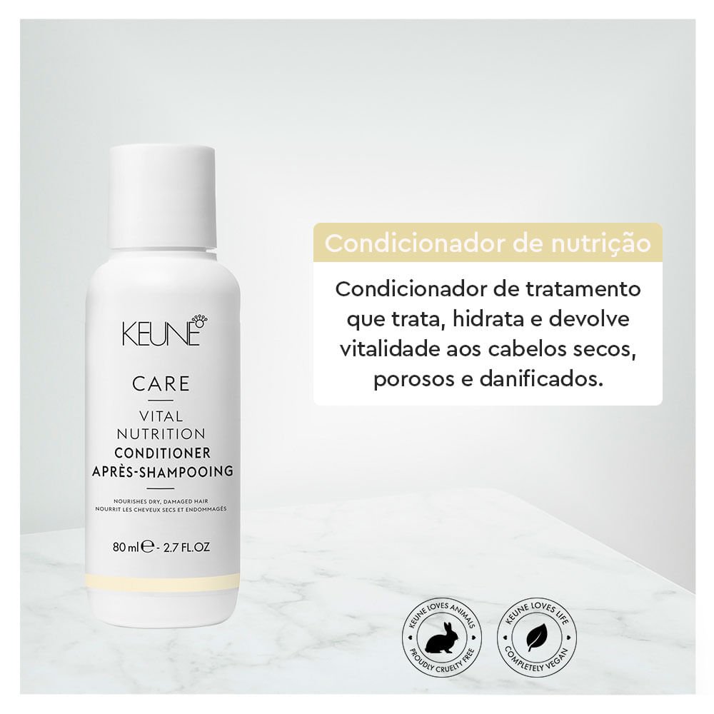 A falta de cuidados faz com que os fios percam a umidade natural, e alguns componentes importantes, resultando em um cabelo frágil e poroso. Para recuperação intensiva dos cabelos danificados, a Keune desenvolveu a linha Care Vital Nutrition, com a inovadora Tecnologia Nutri-Injection que forma uma camada protetora, regenerando e revitalizando os fios danificados. O Condicionador Vital Nutrition dá aquela vida de novo a seus cabelos. Se surpreenda com o condicionador da Keune.