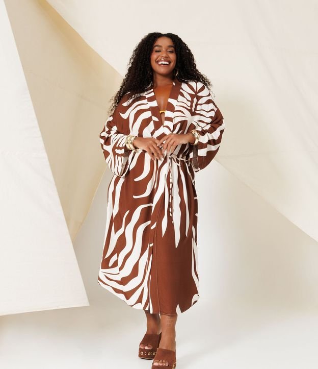 Kimono Alongado com Manga Curta Estampado Curve & Plus Size Marrom