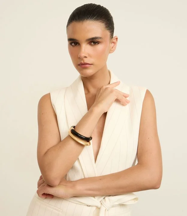 Kit com dois braceletes femininos com estrutura rígida e o outro conta com aro articulado com mola em metal para encaixe prático, oferecendo acessório versátil para complementar diferentes composições.