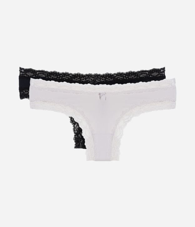 Kit com duas calcinhas confeccionadas em microfibra. As peças modelo biquíni têm renda nas cavas e recorte fio dental no bumbum.