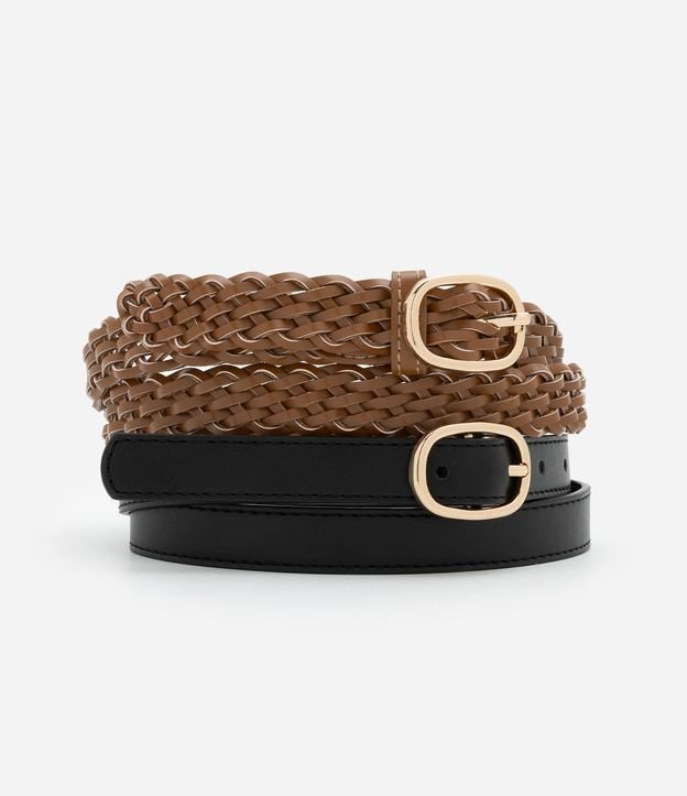 Kit 02 Cintos com Efeito Trançado Tressê e Fivela em Metal Marrom/Preto