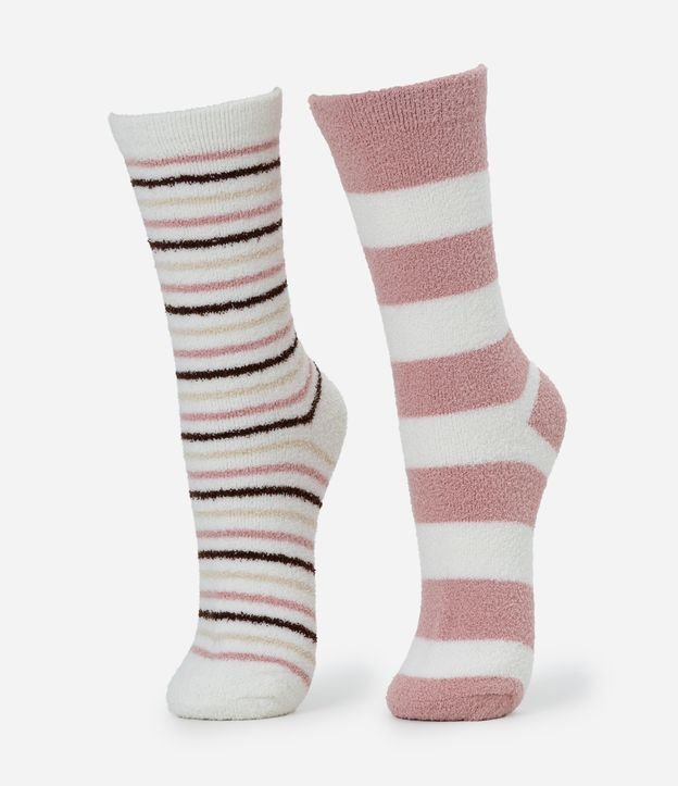 Kit com duas meias femininas confeccionadas em chenille, no modelo cano alto, sendo 01 par com estampa de listras finas e 01 par com estampa de listras largas.