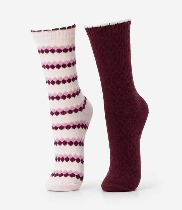 Ki com 02 pares de meia feminina cano médio confeccionada em algodão mais sustentável. Oferece toque macio e ajuste confortável. O kit acompanha dois pares: um com listras em padrão geométrico e outro com superfície lisa em textura discreta.
