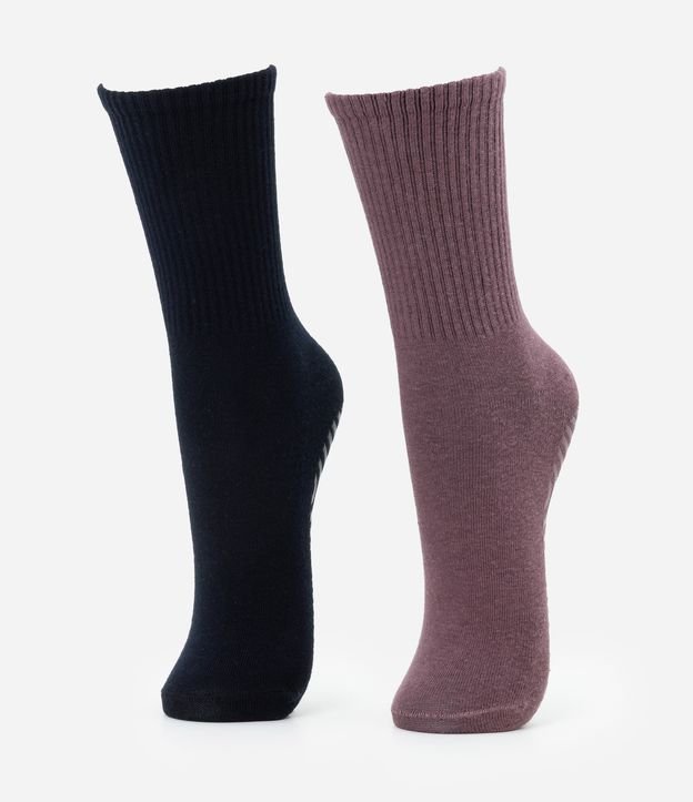 Kit com 02 meias esportivas femininas, confeccionadas em algodão mais sustentável. Modelo cano médio com superfície lisa, cano canelado e aplicação antiderrapante geométrica na sola, garantindo conforto, segurança e estilo para compor looks casuais.