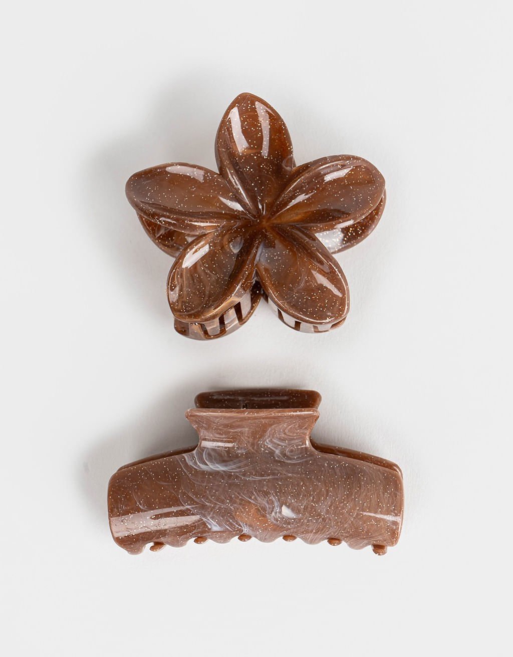 Kit composto por duas s de cabelo com design elegante e acabamento marmorizado na cor marrom. Inclui uma em formato de flor e outra clássica, ambas confeccionadas em material resistente, ideais para prender os fios com praticidade e estilo. Perfeito para uso diário ou para dar um toque sofisticado ao visual.