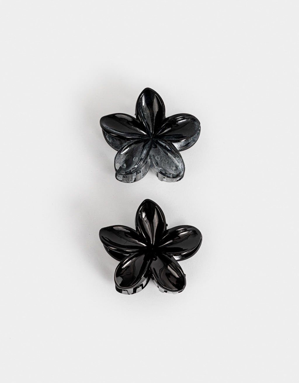 Kit com 2 presilhas para cabelo em formato de flor, confeccionadas em material resistente com acabamento brilhante. Inclui uma presilha na cor cinza e outra preta, ambas com dentes internos para fixação segura. Ideal para prender os fios com praticidade e dar um toque elegante ao visual.