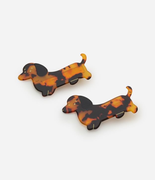 Kit infantil de presilhas de cabelo confeccionadas em plástico rígido com acabamento marmorizado. Possuem formato de cachorro salsicha e fechamento metálico tipo presilha, garantindo firmeza ao prender os fios.