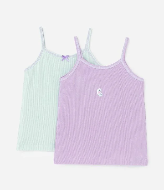 Kit com duas regatas infantis em ribana de toque macio. As peças possuem alças finas, acabamento canelado e detalhes delicados, incluindo bordado de cavalo-marinho — símbolo presente em contos marítimos — e laço aplicado, garantindo charme e conforto ao dia a dia.