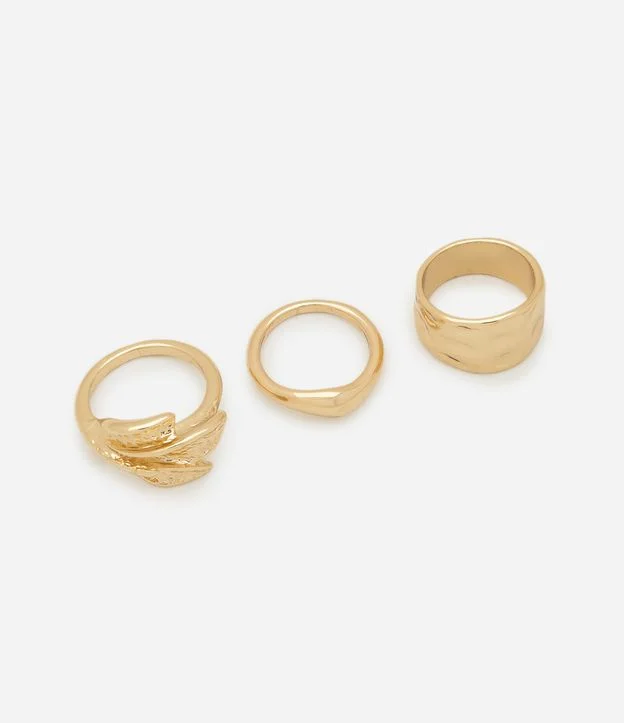 Kit com 3 anéis confeccionados com boas práticas ambientais. Inclui um modelo com cristal, outro liso e um com detalhe de folha, todos com banho light gold para um toque sofisticado.