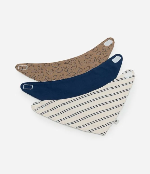 Kit com três babadores infantis confeccionados em algodão certificado BCI e boas práticas ambientais. Possuem formato bandana, fechamento em velcro e mix de estampas, incluindo dinossauros e listras, garantindo proteção, absorção e estilo para acompanhar as primeiras refeições.