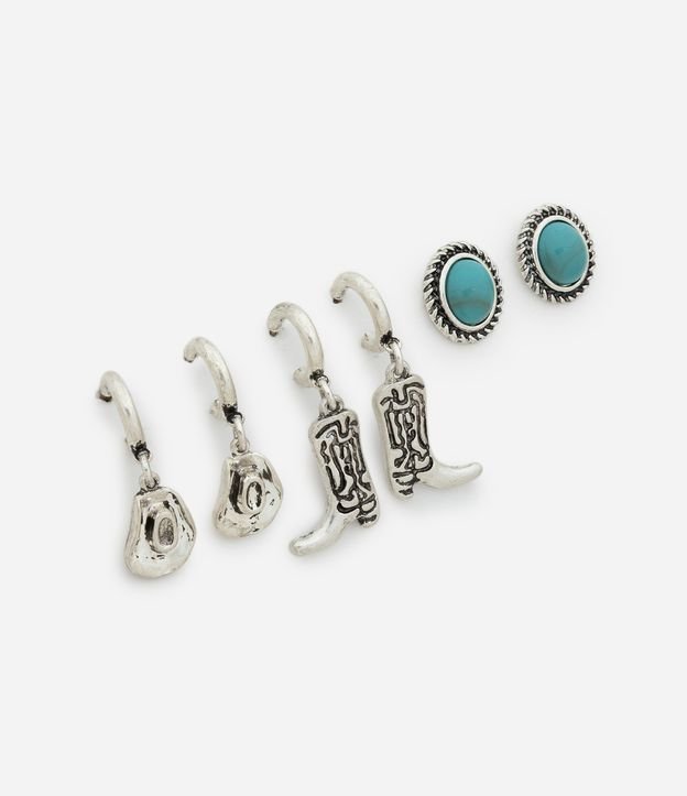 Kit com três brincos confeccionados em metal reciclado com banho prata envelhecida. Inclui duas argolas com pingentes de bota e chapéu e um botão com aplicação de resina verde. Charmoso e versátil.