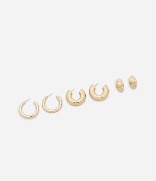 Kit 03 brincos femininos sendo um brinco argola liso, um brinco argola com textura acompanhados de um brinco botão com textura.