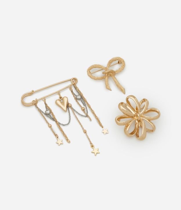 Kit com três broches em metal com banho ouro batido: laço, flor e modelo com corrente e pingentes de coração e estrelas. Versátil para personalizar blazers, camisas e acessórios. Confeccionado em material e processo mais sustentável com boas Práticas Ambientais.