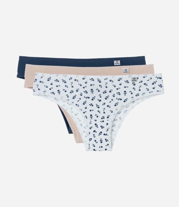 Kit com três calcinhas biquíni de microfibra da marca DelRio. São duas peças lisas e uma estampada de flores.