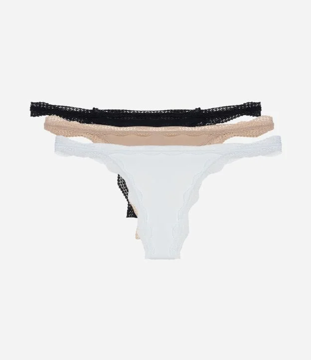 Kit com três calcinhas confeccionadas em microfibra. A peças são sem estampa, fio e com detalhes em renda.