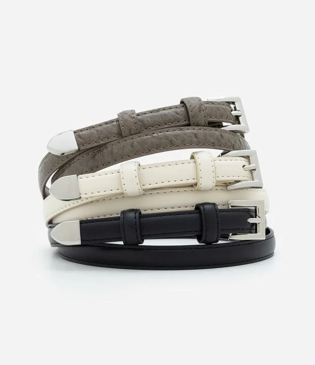 Kit com três cintos finos femininos confeccionados em PU. Cada modelo possui fivela quadrada metálica e ponteira combinando. Todos incluem passante e furos de ajuste, sendo peças leves e práticas para uso diário.