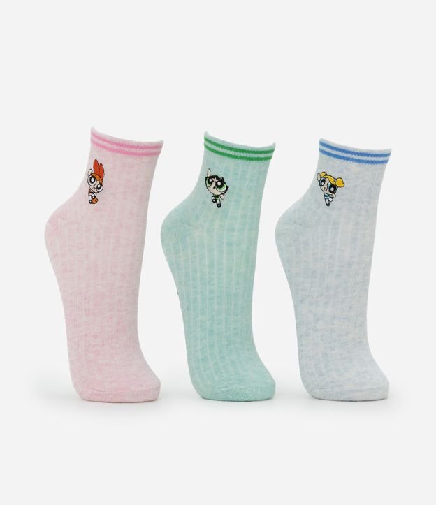 Kit com 03 meias confeccionadas em algodão mais sustentável através de boas práticas ambientais. Modelo cano baixo com superfície mesclada, punho com listras contrastantes e aplicação dos personagens florzinha, lindinha e docinho do clássico desenho as meninas superpoderosas.