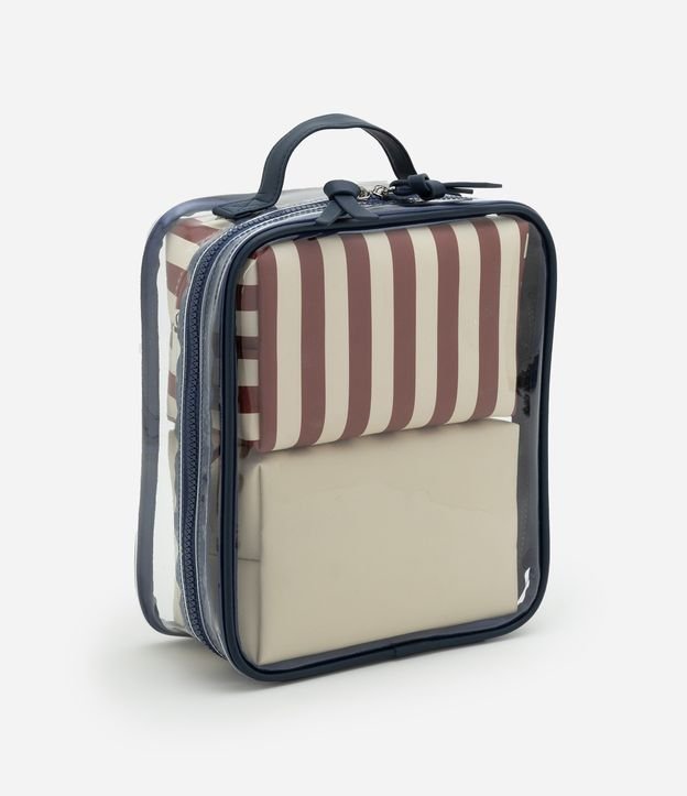 Kit 03 nécessaires feminina sendo uma grande transparente com alça de mão, fechamento lateral por zíper acompanhado de duas nécessaires retangulares médias, uma listrada e outra sem estampa, fechamento por zíper.