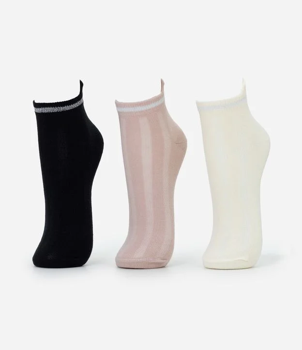 Kit 03 Pares de Meia Cano Baixo em Algodão com Detalhe Metalizado Rosa/Preto/Off White