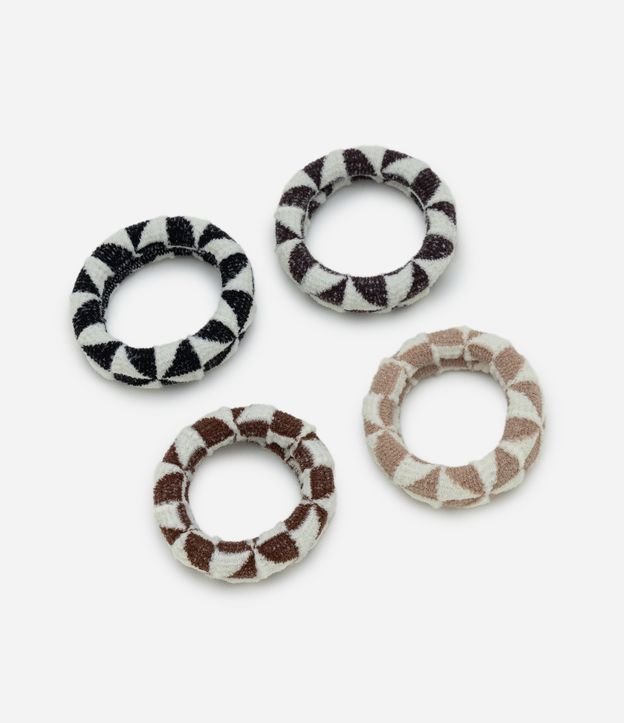 Kit com 04 borrachinhas de cabelo confeccionadas em poliéster. Possuem estampa geométrica.