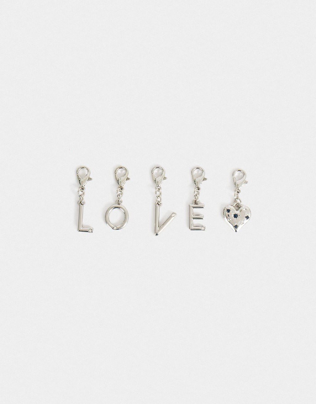 Conjunto de 5 pingentes: com letras formando a palavra LOVE com coração com strass
