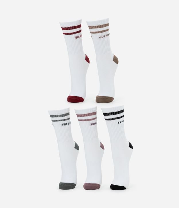 Kit com 05 meias esportivas feminino, confeccionadas em algodão mais sustentável através de boas práticas ambientais. Modelo cano alto com superfície lisa, listras contrastantes no cano e lettering aplicado, garantindo estilo esportivo e conforto para o dia a dia.