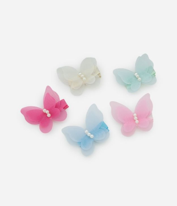 Kit com cinco presilhas de cabelo em formato de borboleta, acabamento texturizado e aplicação de pedrinhas que adicionam brilho delicado. Base tipo bico de pato com fita para melhor fixação em mechas. Composição em poliéster, ideal para looks do dia a dia.