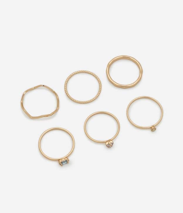 Kit de 06 anéis de metal com diferentes formatos delicados. Sendo 03 deles finos com detalhes de strass coloridos, 01 deles martelado, 01 com textura torcida e 01 modelo aliança.