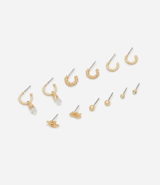 Kit com 6 brincos confeccionados com boas práticas ambientais. Modelos variados com banho light gold, incluindo argolas lisas, torcidas e com pingente cristal, garantindo elegância e versatilidade para compor looks modernos.