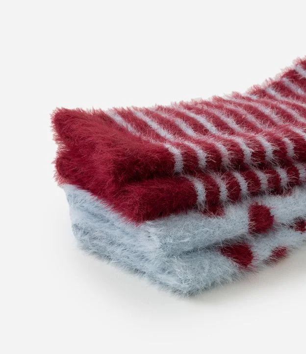 Kit com 2 pares de meias de cano alto, confeccionadas em poliamida com pelo artificial, oferecendo toque extremamente macio e sensação aconchegante, ideal para os dias mais frios. O conjunto apresenta duas variações de design: um par com padronagem poá em tom bordô sobre fundo azul e outro com listras horizontais contrastantes, ambos com acabamento felpudo em toda a peça. As meias possuem punho confortável que garante boa fixação sem apertar, sendo perfeitas para uso doméstico e composições casuais de inverno.