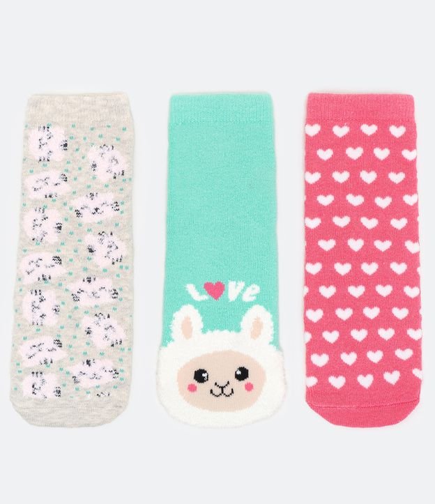 Kit 3 Meias Infantis Atoalhadas Estampa Corações e Ovelha - Tam 19 ao 34