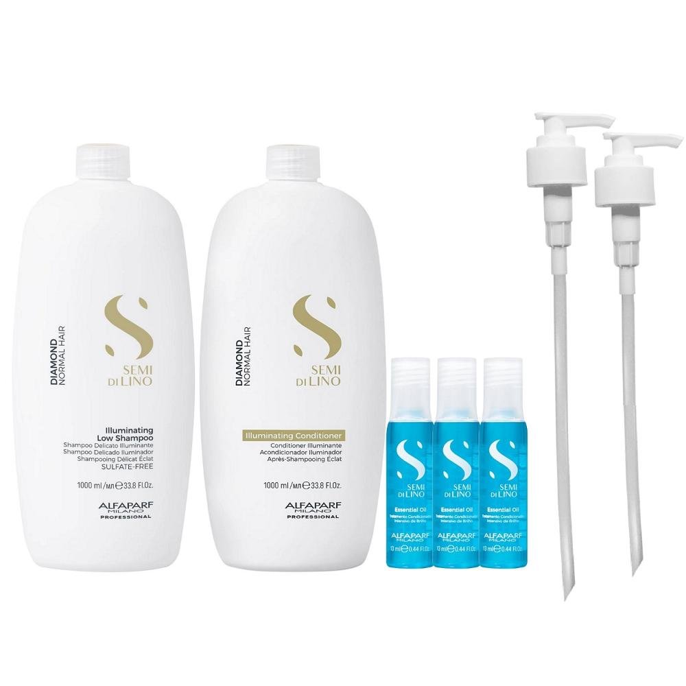 Kit Alfaparf Semi Di Lino Diamond - Shampoo 1L + Condicionador 1L + 3x Ampola 13ml + Válvula Pump ÚNICO
