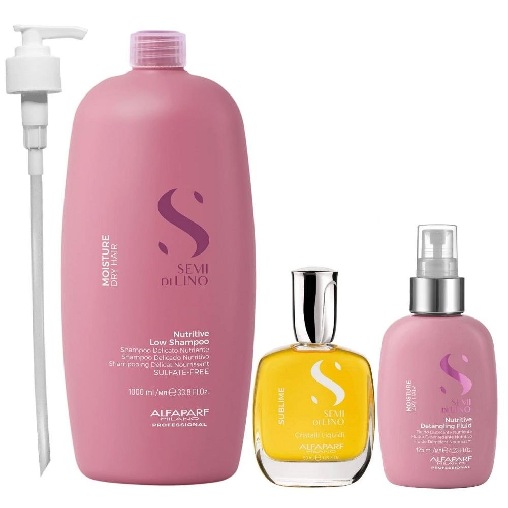 Kit Alfaparf Semi Di Lino Moisture - Shampoo 1L + Fluído 125ml + Cristalli 50ml + Válvula Pump ÚNICO