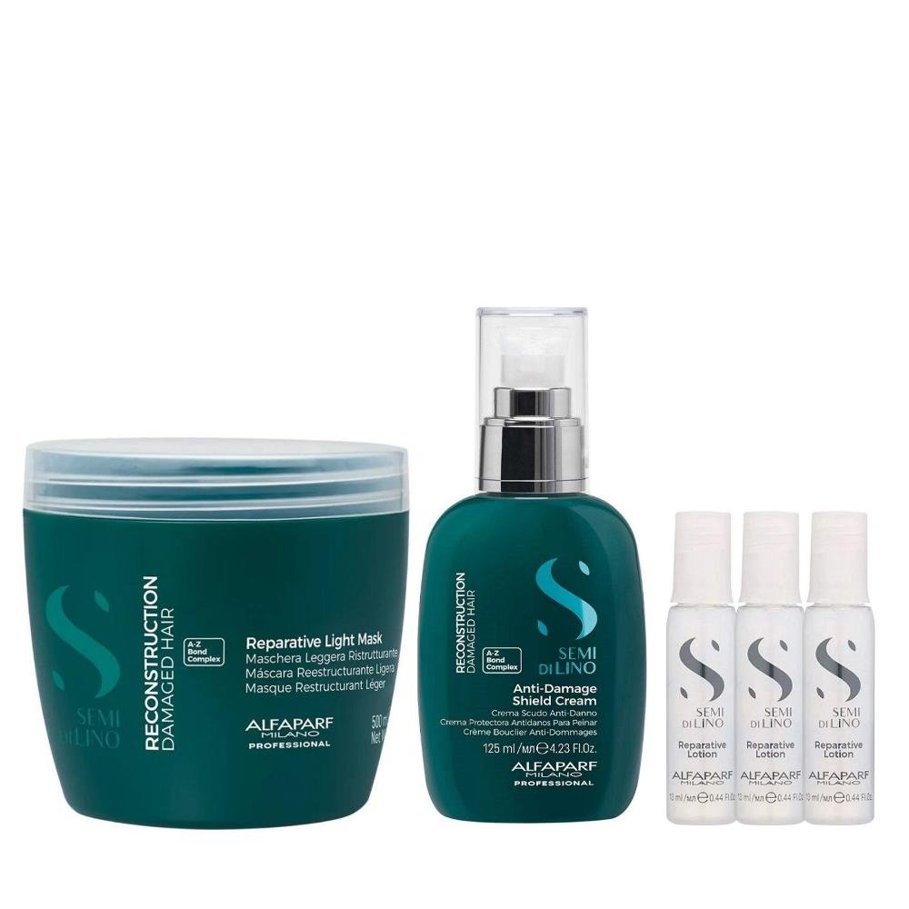 Kit Alfaparf Semi Di Lino Reconstruction - Máscara Suave 500ml + Creme 125ml + 3x Ampola 13ml ÚNICO